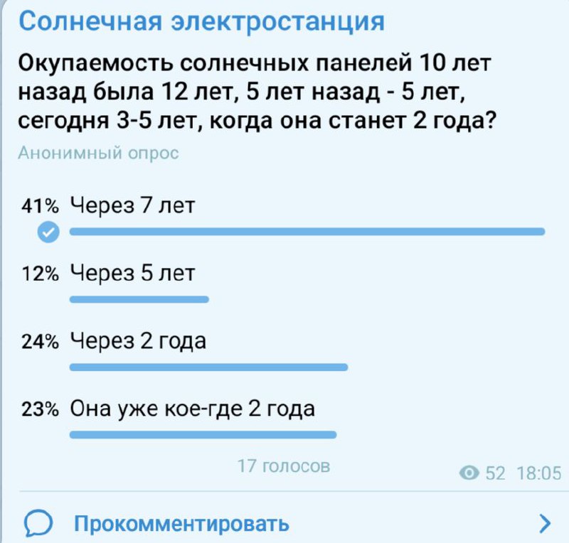 Солнечная энергетика стремительно дешевеет. Всего 10 лет назад панели окупались за 12 лет, пять лет назад — за 5, а сегодня — уже за 3-5 лет. Следующий рубеж — всего 2 года. Но когда его ждать?